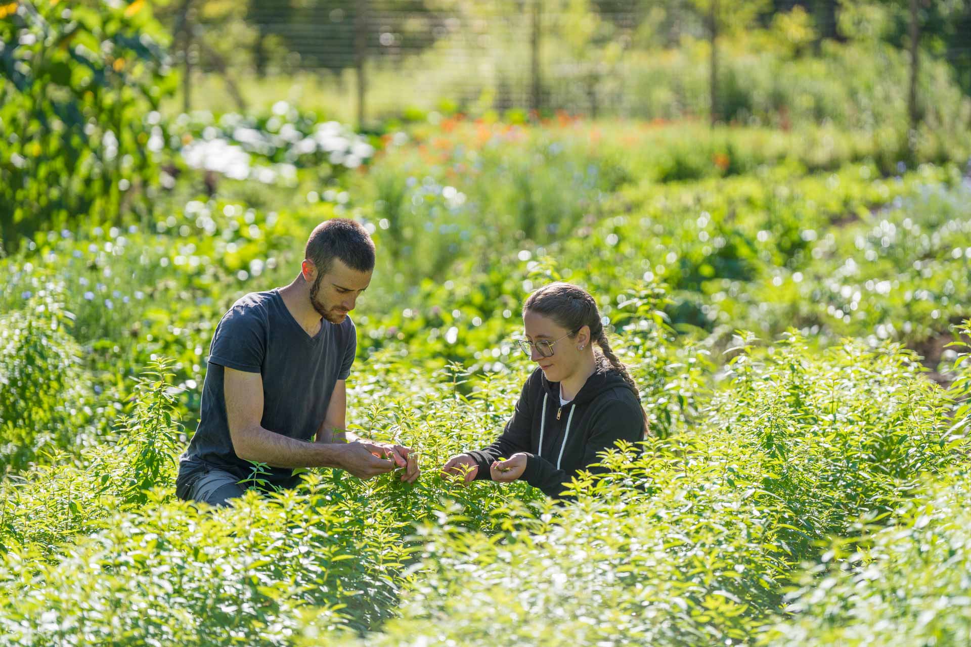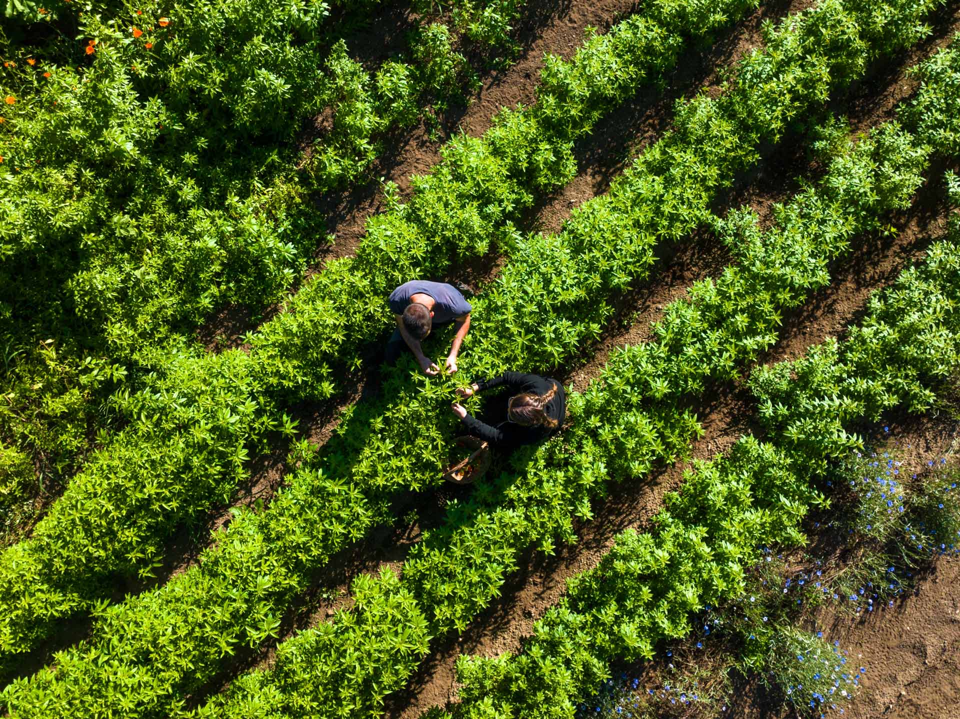 Il campo inizia a vestirsi di colori: i fiordalisi, con le loro sfumature infinite, danzano nel vento, mentre la Monarda, dal rosso scarlatto, risplende come un fuoco tra le piante. Le prime raccolte sono lì, pronte: le foglie più grandi, ricche di energia e profumo. Ogni raccolta è un gesto preciso, lento, manuale: foglia per foglia, selezioniamo le migliori, le più generose, e le portiamo al riparo per essiccare. Presto, queste meraviglie della natura saranno confezionate e pronte per i primi mercatini estivi.
