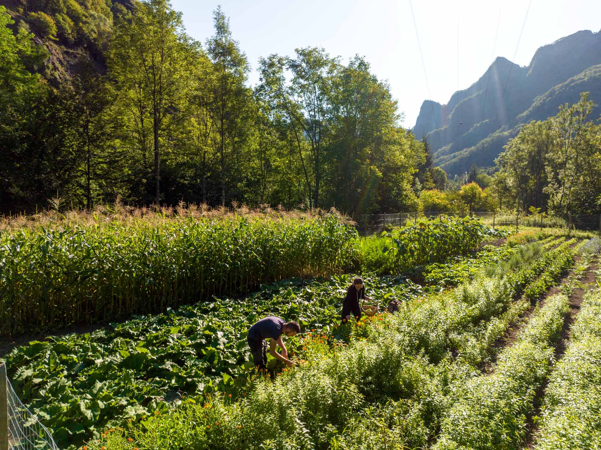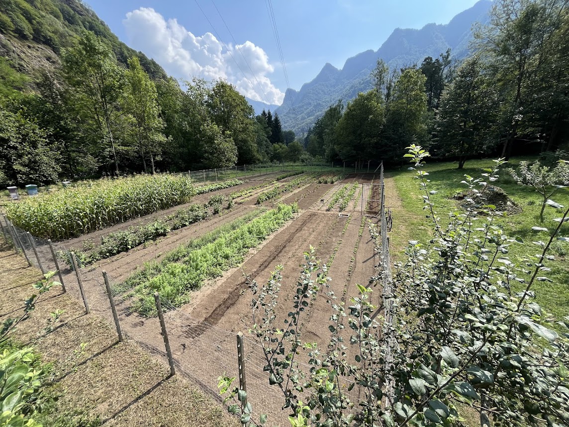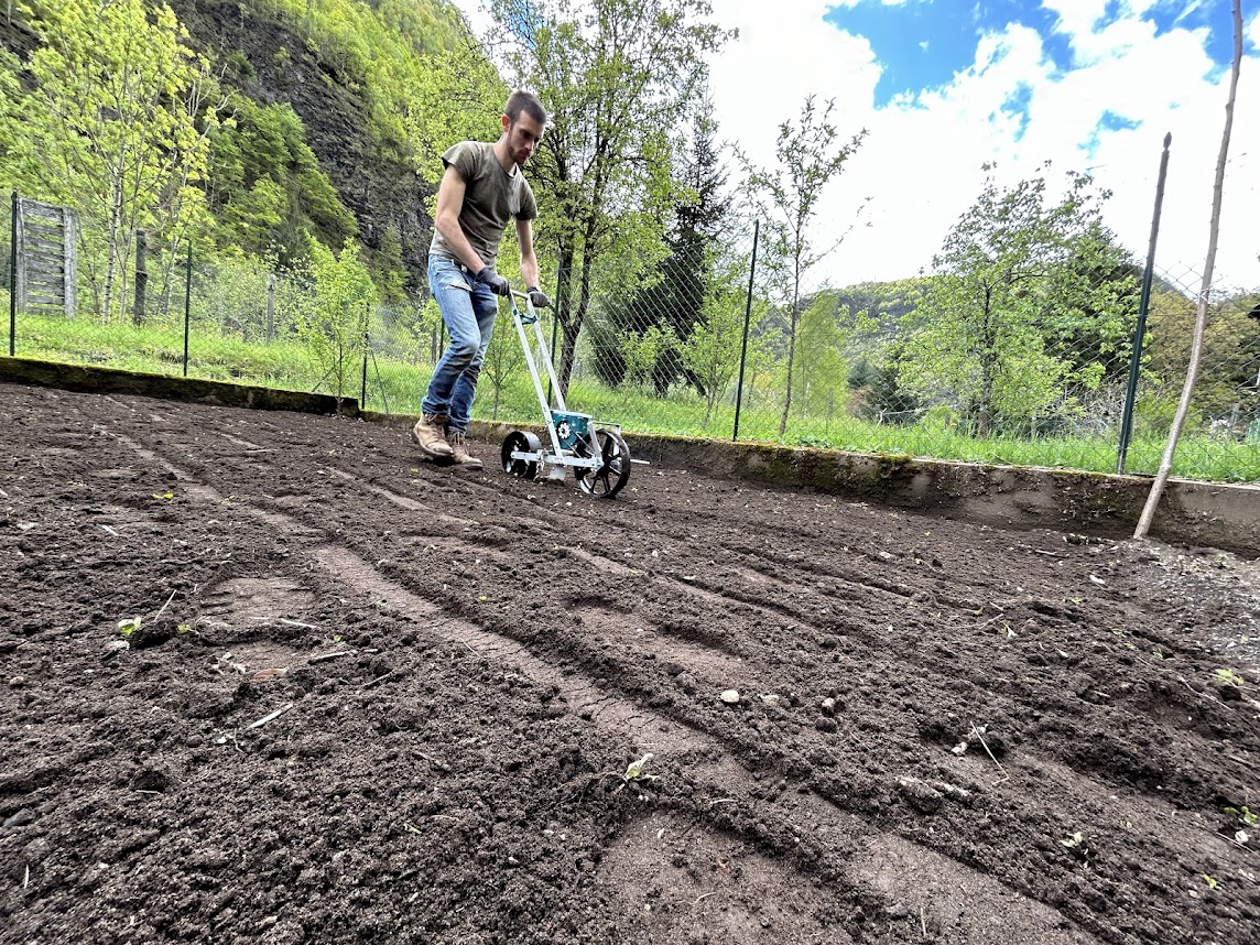 Le prime semine avvengono all'inizio di aprile, talvolta protette da veli leggeri, per preservarle dall'improvvisa freddezza delle mattine primaverili. Ogni seme è piantato con cura, sotto un cielo che comincia a schiarirsi e a scaldarsi. Il ponte del 25 aprile segna l'inizio ufficiale della nostra stagione agricola, un momento atteso con ansia: è il tempo di seminare il mais Marano, di mettere a dimora le patate da semina e di avviare la messa a dimora delle piante officinali, una dopo l'altra, con l'avanzare delle settimane.